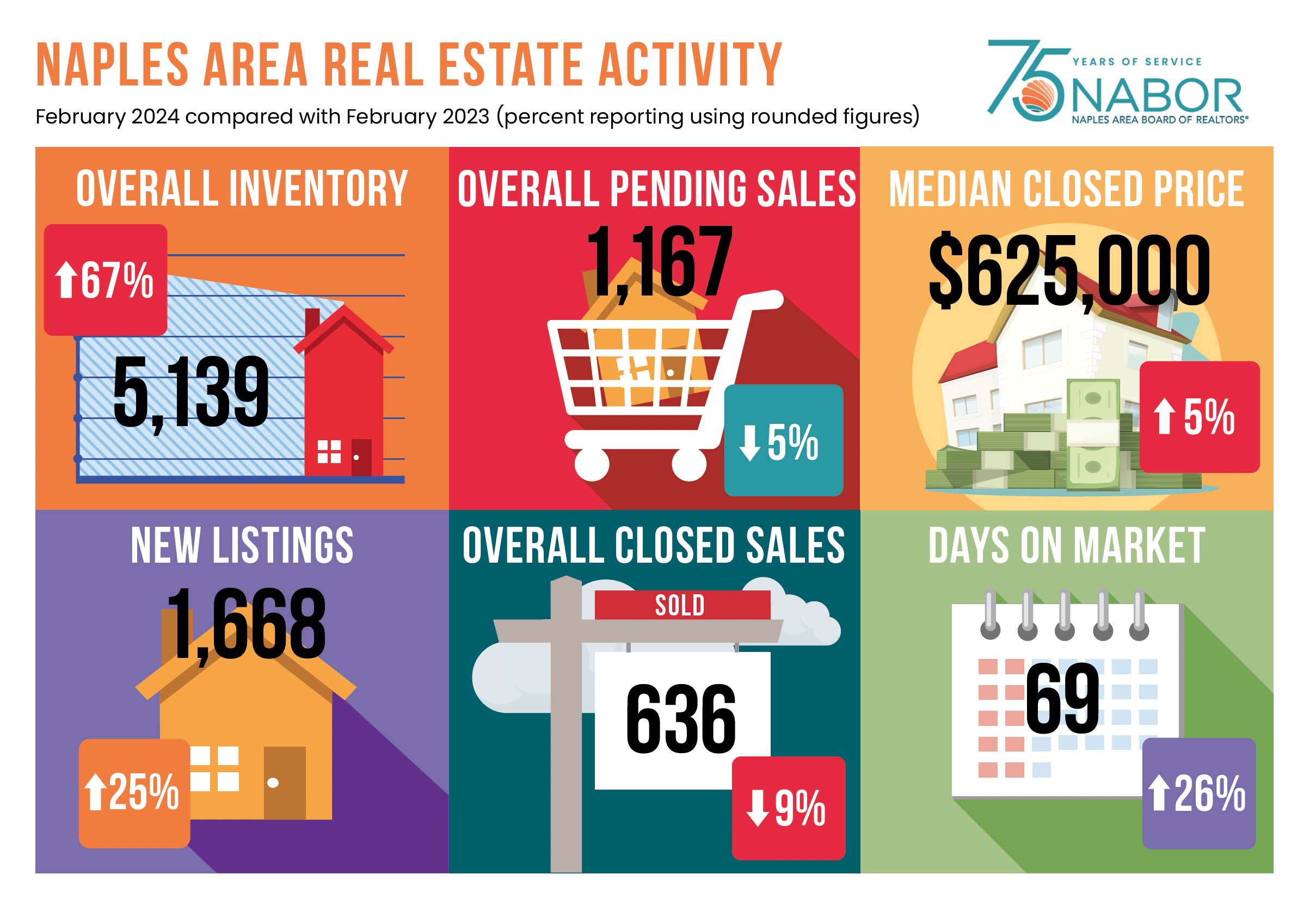 The overall median closed price in Naples increased 5 percent to $625,000 in February from $595,188 in February 2023, but there were also 2,264 price decreases reported. Brokers contend that price decreases may be one indication that sellers are shifting from aspirational pricing to realistic market pricing. According to the February 2024 Market Report by the Naples Area Board of REALTORS® (NABOR®), which tracks home listings and sales within Collier County (excluding Marco Island), closed sales decreased 9.3 percent in February despite a 66.6 percent increase in inventory to 5,139 properties from 3,085 properties in February 2023.