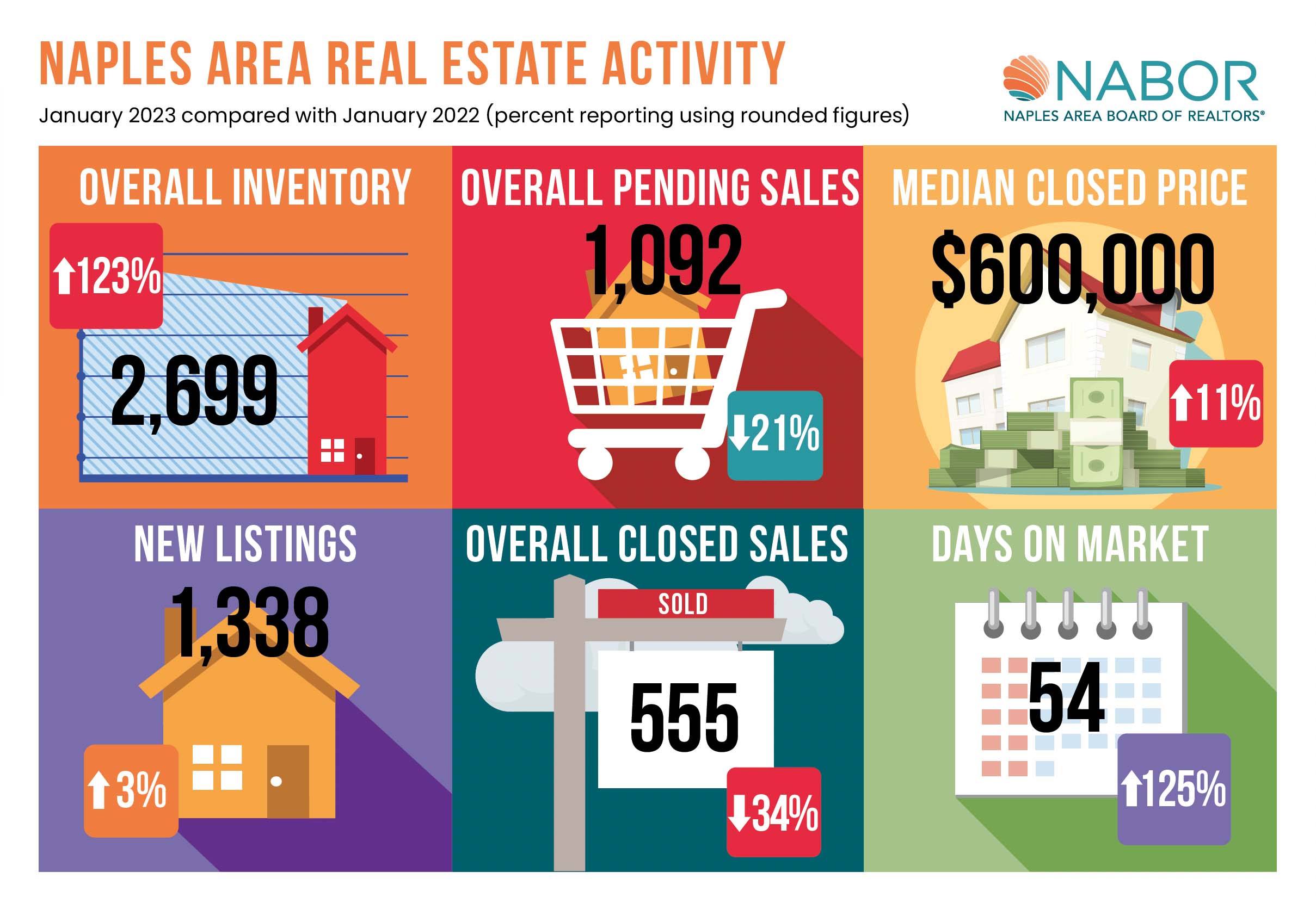 Evidence of growing confidence in the Naples real estate market revealed itself in January as a wave of new sellers entered the market during the month. New listings in January rose 74.5 percent compared to December 2022, and 3.2 percent to 1,338 new listings from 1,297 new listings a year ago according to the January 2023 Market Report by the Naples Area Board of REALTORS® (NABOR®), which tracks home listings and sales within Collier County (excluding Marco Island). But the rise in home options during January did not stymy home values as median closed prices rose 11.1 percent to $600,000 from $540,000 in January 2022.