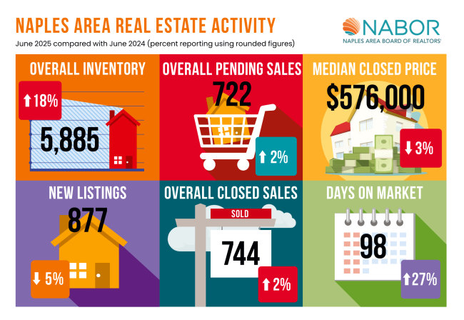 Even with predicted decreases in home inventory during the summer, buyers searching homes in Naples will enjoy more options this summer than any summer in the last 10 years. According to the June 2025 Market Report by the Naples Area Board of REALTORS® (NABOR®), which tracks home listings and sales within Collier County (excluding Marco Island), inventory increased 18.2 percent to 5,885 homes from 4,978 homes in June 2024. Along with a healthy pool of options, a moderate softening of home prices sparked a 1.5 percent increase in both pending and closed sales during June. Broker analysts reviewing the report said the 1,282 sellers who removed their homes from the market during June will miss out on what may become a very good summer for sales in Naples.