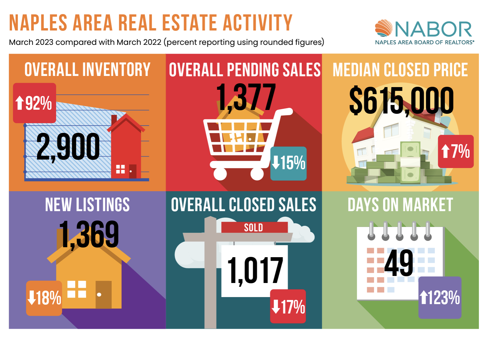 Naples, Fla. (April 26, 2023) – Closed sales of homes in Naples during the first quarter of 2023 exceeded closed sales reported in the first quarter of 2019 (pre-COVID) when inventory levels were nearly three times the current level. According to the March 2023 Market Report by the Naples Area Board of REALTORS® (NABOR®), which tracks home listings and sales within Collier County (excluding Marco Island), overall inventory in March increased 92.4 percent to 2,900 properties from 1,507 properties in March 2022. While still historically low at 3.6 months of inventory, overall inventory in Naples has continued to increase ever since it bottomed out at 0.8 months of inventory in December 2021.