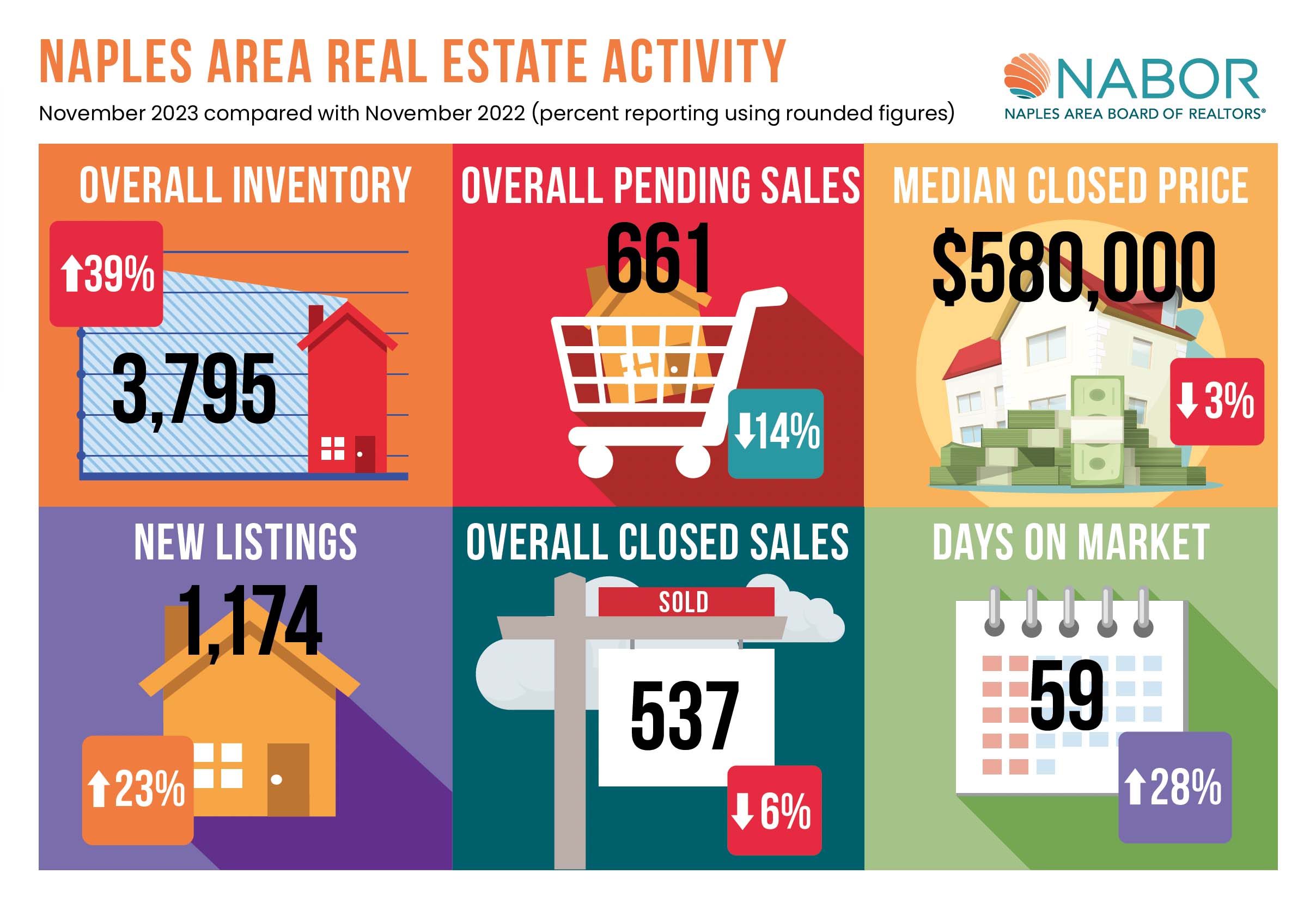 – Overall inventory of homes in Naples for November increased 38.8 percent to 3,795 properties from 2,734 properties in November 2022. Buyers have not enjoyed a level of choice since September 2020. The month also included 1,080 price decreases resulting in a 3.3 percent decrease in overall median closed price. According to the November 2023 Market Report by the Naples Area Board of REALTORS® (NABOR®), which tracks home listings and sales within Collier County (excluding Marco Island), data showed the housing market is poised to enjoy healthy winter sales, but it will depend on whether sellers continue to price their homes to sell and whether buyers feel the investment is right.